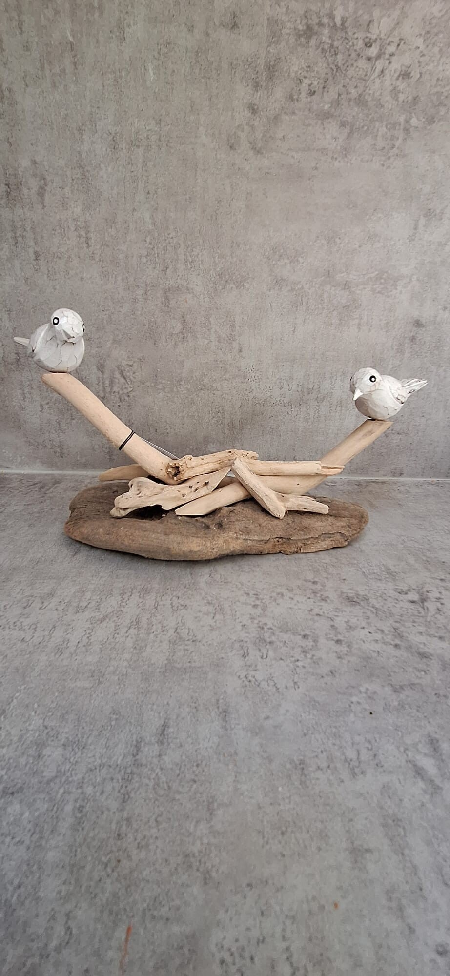 Deze twee houten vogels zitten op stukjes gevonden hout.