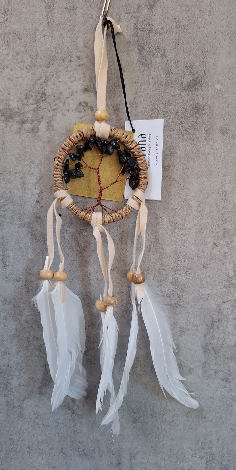 Droomvanger (mini) met levensboom van amethist en witte veren.
